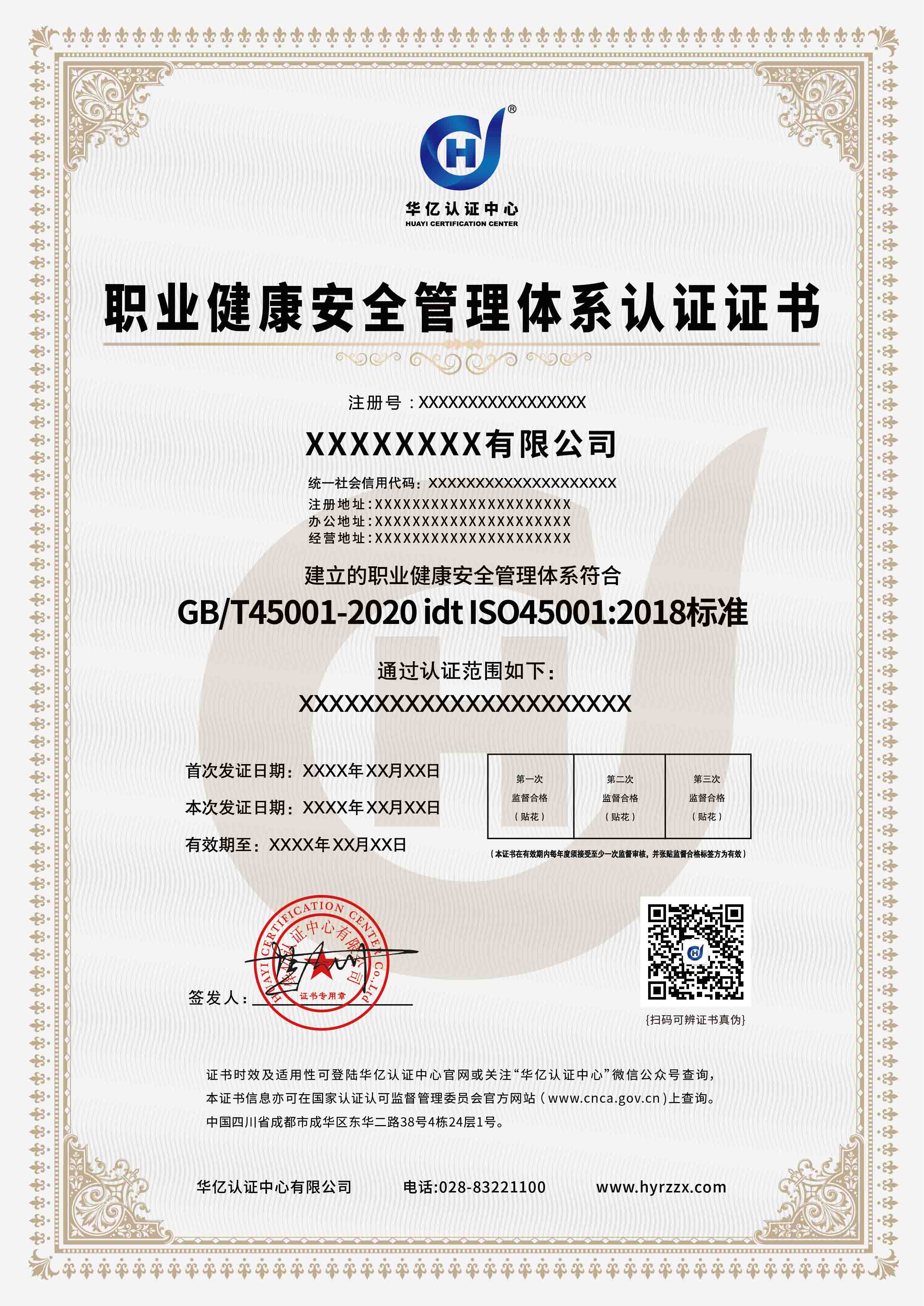 职业健康安全管理体系证书